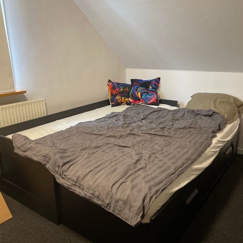 Se mål på billede 5. Sengen er halvandet år gammel. 2 stk. pæne madrasser følger med. Skifter den kun pga vi har brug for en større seng.