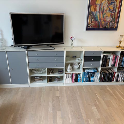 Montana 2 sektioner skuffer med hhv 2 og 4 skuffer. Har bredde til at der kan stå cd’er i.