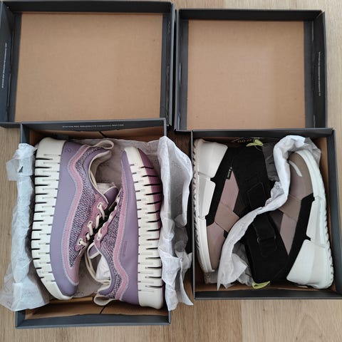 Skoene er helt nye. De er brugt to gange kort, fordi de var for smalle (meget brede fødder)