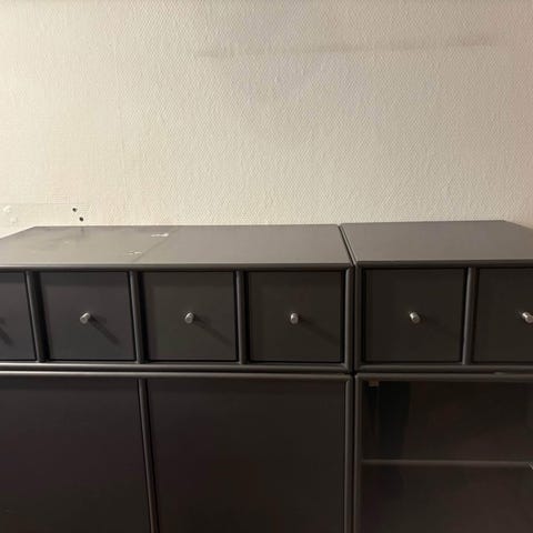 Montana reol med åbne skuffer og en hylde i den ene side og åben rum til bøger, ringbind, LP’er eller lign.