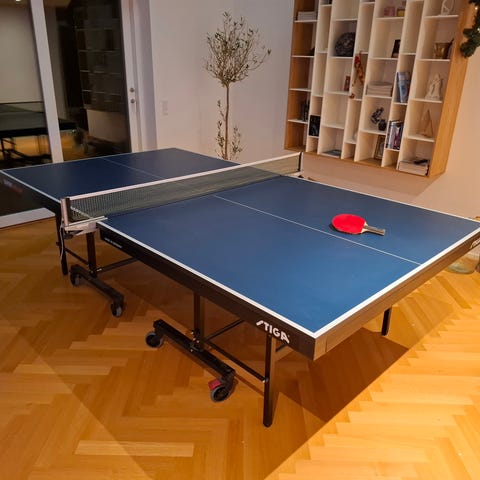 Stiga bordtennisbord action roller med foldbar funktion og hjul til nem transport og opbevaring. Bordet har en sort spilleflade med hvid midterlinje og kantbånd. Designet til indendørs brug og egnet til både fritid og træning.
