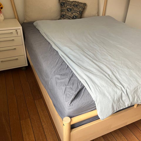 Pæn og velholdt dobbeltseng med gråt stof incl. topmadras.