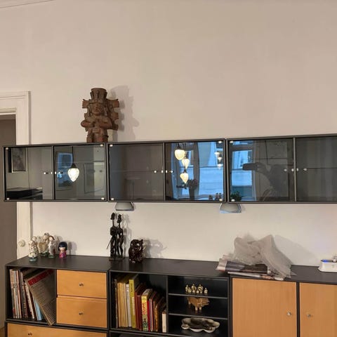 Montana vitrineskabe med glaslåger og lys under skabene. Der er beskyttelse i bunden af skabene. Der er ophæng og skruer til hvert skab.