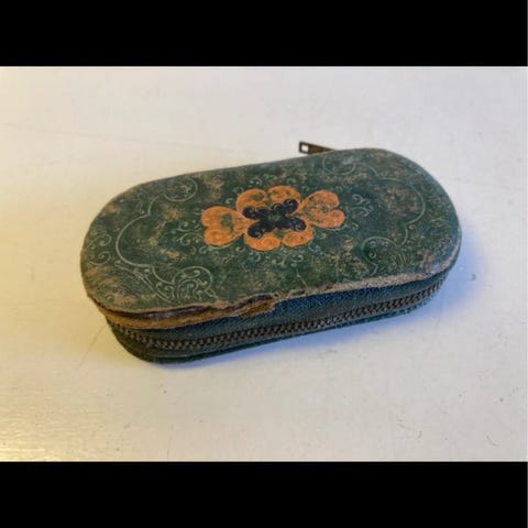 Antik miniature kuffert. Læderindbundet med messing beslag. Formentlig tidlig 1900-tallet.