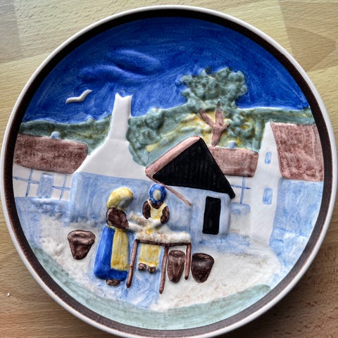 Bing & Grøndahl Sonja porcelænssæt bestående af flere dele. Sættet inkluderer et ovalt fad med håndtag. Porcelænet er fremstillet i Danmark og har en enkel, tidløs design.