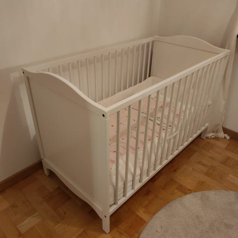 2300 kr fra ny, 2-3 år gammel. Købt fra Coop Møbler, mærket Bino Nelli og madras fra Ænglemark. 120x60.
