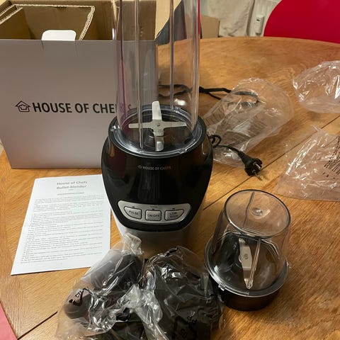 House of Chefs blender med flere tilbehørsdele, herunder en stor beholder, mindre beholdere med låg og en base med kontrolknapper. Farve: sort. Materiale: plast og metal. Velegnet til blendning og forberedelse af forskellige fødevarer.