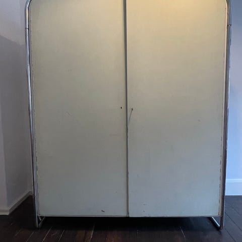 Flot og rummelig dansk kommede fra 1960'erne. Indeholder et stort rum med 2 hylder, og 2 skuffer i bunden. Den har en mindre misfarvning fra et strygejern på toppen. Et mindre stykke af et af håndtagene på skufferne har været knækket af, og er blevet limet på igen.