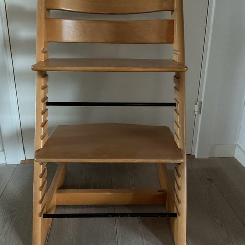 Stokke højstol i træ med justerbar sidde- og fodplade. Designet til børn, der kan tilpasses i højden efter barnets vækst. Farve: naturlig træfinish.