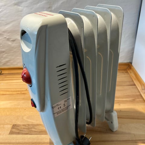 Biltema 43-3015 oliefyldt radiator med en effekt på 2000 W. Radiatoren er hvid og designet til opvarmning med olie som varmeelement. Den har to justerbare drejeknapper til temperaturkontrol og en integreret bærehåndtag for nem transport.