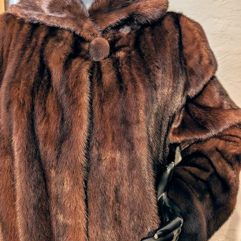 SAGA pels af mink og skind. Er kåbeformet. Ingen brugsspor. Pelsen er lugtfri.