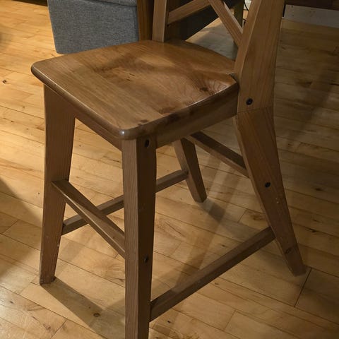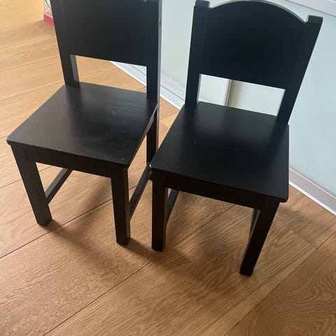 IKEA Børnestol i rød farve. Stolen er designet til børn og er fremstillet i træmateriale. Den har et enkelt og robust design med udskårne detaljer på ryglænet.