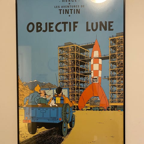 Tintin On a Marché sur la Lune plakat med motiv af astronauter og raket på månen. Plakaten viser en illustration i farver med Tintin-tema.