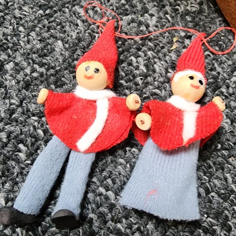 Et nissepar på cykel, Nisserne er 40 cm. Nissefars perleøjne skal syes.