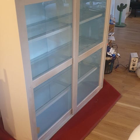 fint vitrineskab fra IKEA. Det ene låge har et mindre hak. Kan enten vende op eller nedad.