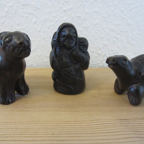 Sæt bestående af fire figurer i keramik og porcelæn: to små mennesker, en pindsvinfigur og en fuglefigur, der også kan bruges som lysestage. Farverne er primært blå, sort, hvid og røde nuancer. Figurerne har dekorative detaljer og kan anvendes som pynt eller samlerobjekter.