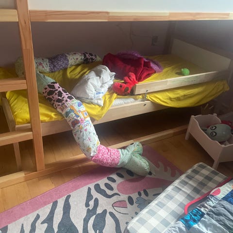 Juniorseng i god stand - kan hæves med supplerende IKEA moduler så man kan have legeplads el skrivebord under