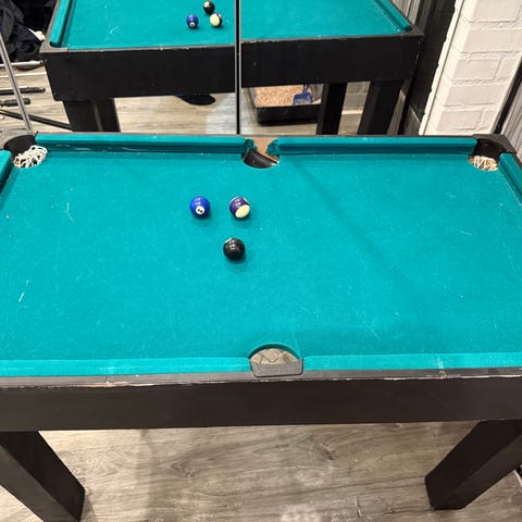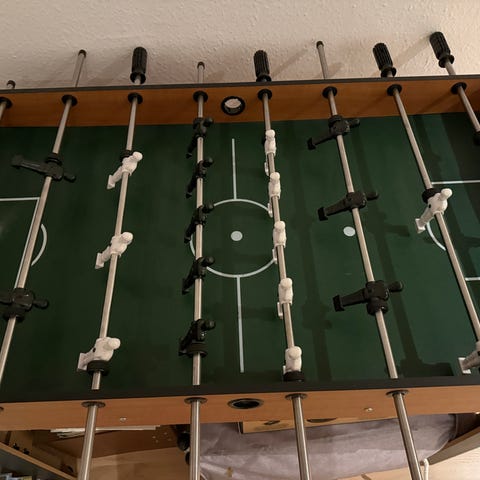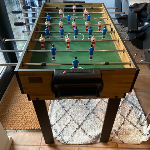 Kombineret bordfodbold- og basketballspil med integreret boldopsamler og net. Den ene opsamler til pool er blevet væk