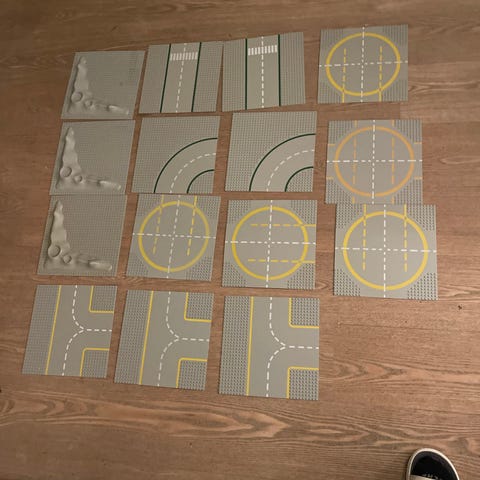 LEGO City vejplader til brug med LEGO byggesæt. Pladerne har forskellige vejsektioner inklusive lige strækninger, kurver og kryds. Farven er grå med hvide vejmarkeringer. Pladerne kan kombineres for at skabe forskellige vejlayouts.