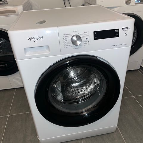 Whirlpool Frontbetjent vaskemaskine med digital display og flere vaskeprogrammer. Maskinen har en frontbetjent dør og er designet til almindelig husholdningsbrug. Den er købt i september 2024, brugt af ældre mand, derfor begrænset brug. Ny pris 2800 kr.
