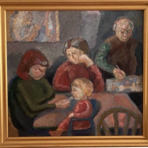 Groth Jensen 1960 (familie samlet om bord) - Indrammet Maleri med signatur.