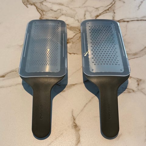 Eva Solo rivejern i rustfrit stål med to forskellige riveflader. Designet til effektiv rivning af madvarer som ost, grøntsager og citrus. Kompakt og let at opbevare med integreret holder. Sælges samlet. Sendes ikke.