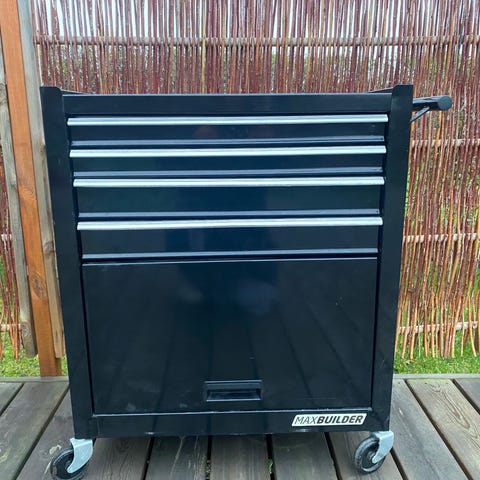 Hazet Assistent værktøjsvogn med flere skuffer i blå og sort farve. Værktøjsvognen har hjul og flere opbevaringsrum, der gør det muligt at organisere og transportere værktøj effektivt.