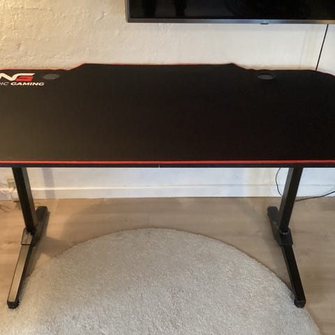 Nordic Gaming gamingbord med sort bordplade og rød kant. Bordet har justerbare ben i sort metal og er designet til gaming med en overflade, der giver god plads til udstyr. Bordet måler 140 cm bredt, 67 cm dybt og 75 cm højt.