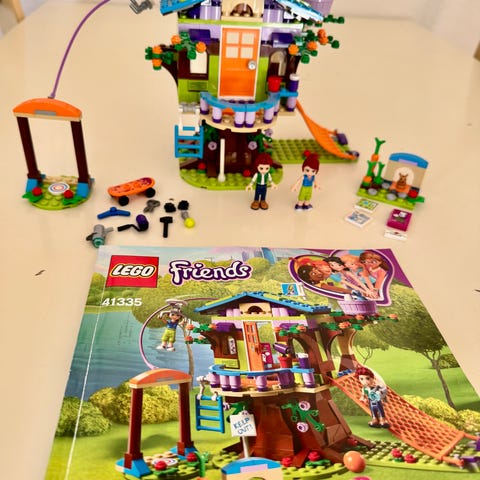 LEGO Friends 41335 Mias trætophus. Træhus legetøjssæt med flere figurer og tilbehør. 6-12 år. Sættet inkluderer et træhus med detaljer som dør, vindue, tag og udendørs elementer. Egnet til børn og samlere af LEGO Friends serien.
