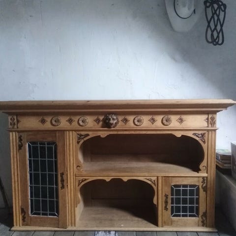 Vintage skænk med spejl og glashylder. Malet sort og med mørkt træ indvendigt.
