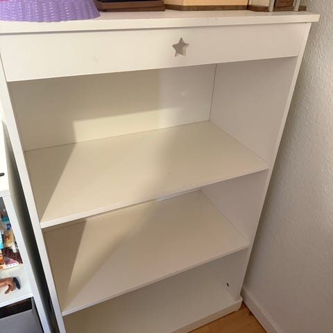 Jollyroom Astrup børnemøbel i hvid farve. Møblet indeholder opbevaringskasser og hylder, velegnet til organisering af børns legetøj og ting.