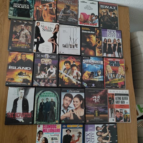 Melle 90 og 100 stk. Blandet samling dvd-film i forskellige genrer. Forskellige titler og udgaver, både enkeltfilm og bokse. Fysiske dvd-medier egnet til afspilning på dvd-afspiller eller computer med dvd-drev. Evt. levering 2500 Valby.