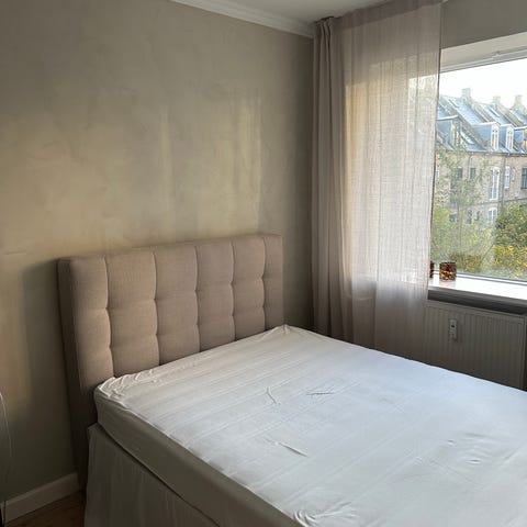 IKEA boxmadres på træben med topmadres, hør sengeskørt og polsteret hovedgærde.