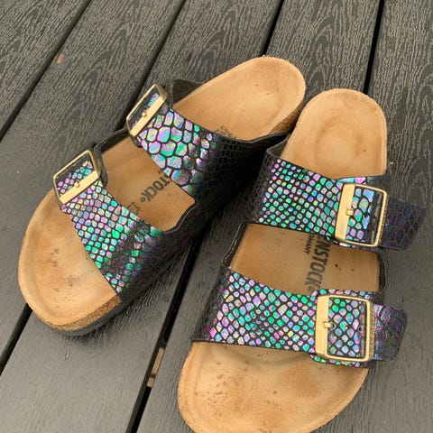Birkenstock sandaler i størrelse 39 i sort. Sandalerne har to justerbare remme med spænder og en ergonomisk formet fodseng. Materialet er holdbart og velegnet til daglig brug.