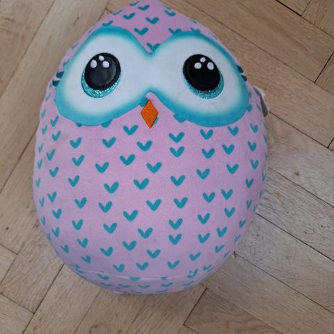 Squishmallows Willoughby bamse i blødt materiale med grå og lysegrønne farver. Designet som en kat med sort næse og øjne samt en lyserød mund. Velegnet som legetøj eller samlerobjekt.