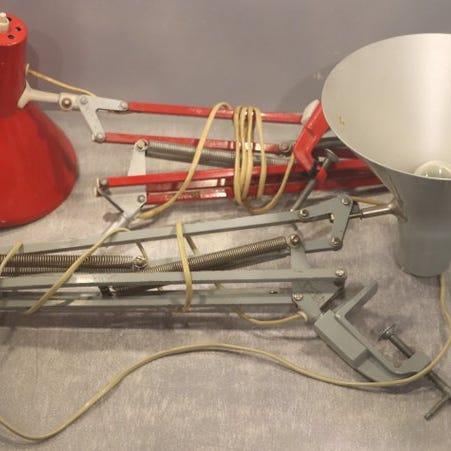 Lampen har en hvid lampeskærm og fjederbalancerede arme.