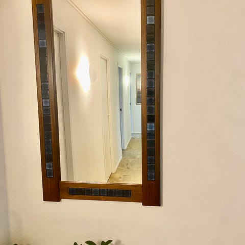 Flot spejl i teak med grønne/blå kakler. Vintage, men i god stand