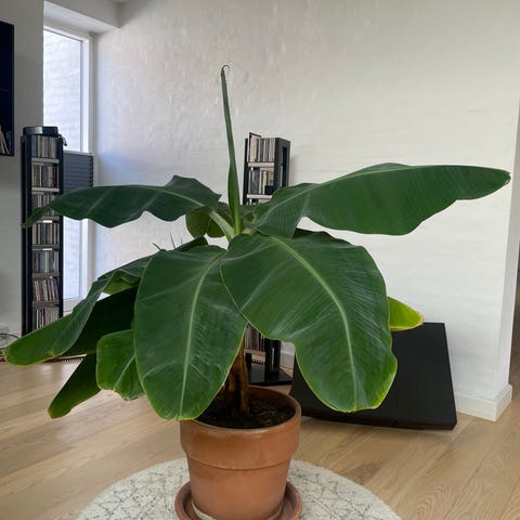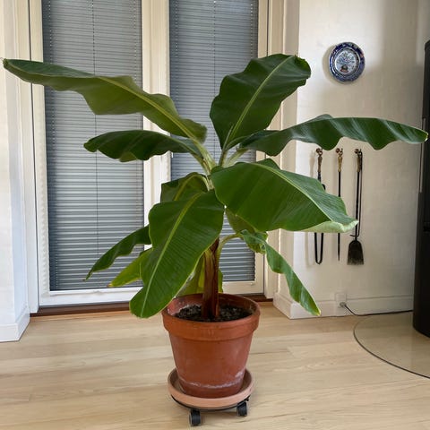 Kunstig bananplante med store grønne blade og en naturlig stilk. Super god kvalitet. Det er næsten ikke til at se at den er kunstig.
