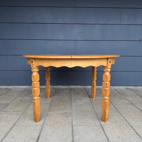 Flot rundt spisebord i massivt eg med to tillægsplader.
