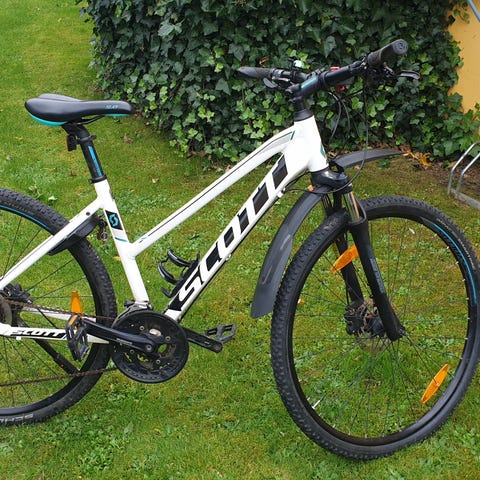 Næsten ny(købt august 25) super cykel med skærme,bagagebærer. Ny pris 8.246kr Størrelse large, metalhvid.Kvittering haves