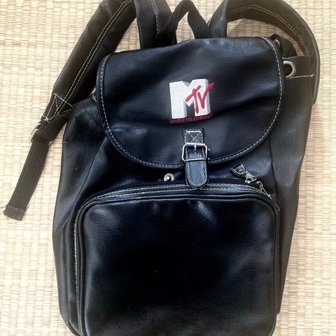 Vintage MTV sort læderrygsæk fra 1990'erne med broderet logo