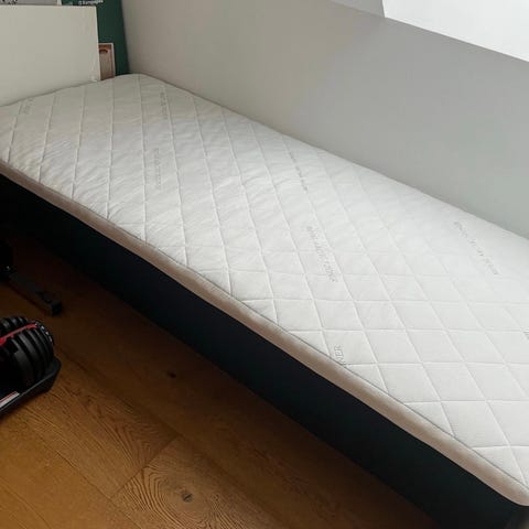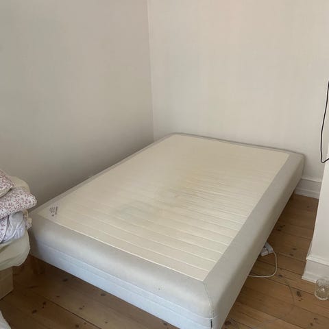 God men brugt IKEA Sultan seng gives væk, da vi ikke kan få den ned i kælderen. Der medfølger fire egetræs ben i højden 20 cm. Der er også topmadras. Den har stået på træklodser i garagen i 2 uger.