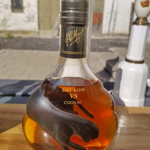Meukow Rarissime Tres Vieux ( mere end 70 år gammel) cognac. Flaske med lakprop, flaskenummer nr. 239 af ialt 600 producerede flasker. Flasken fremstår perfekt i tilhørende trækasse.