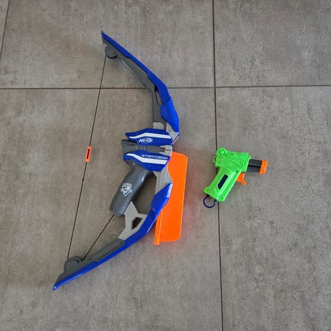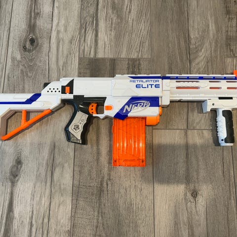 Nerf pistol N-Strike Elite Strongarm, 6 skud i og har en rækkevidde på op til 27 meter.
