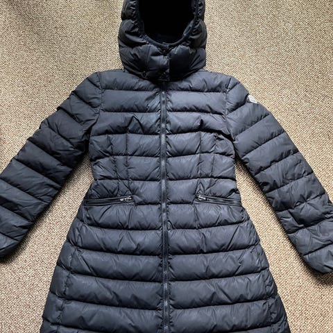 Meget fin dunjakke fra Moncler; god stand, størrelsen er 8 år, meget lille i størrelsen. Der er en lille plet der kan ses på den sidste billede.