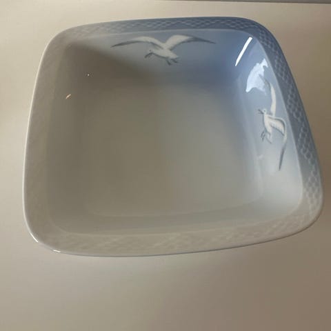 Royal Copenhagen Fajance fad (41cm) med motiv af tre flyvende måger. Fadet har en oval form med blå og hvide farver og er fremstillet i fajance. Egnet til servering af mad eller som dekorativt element.