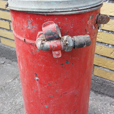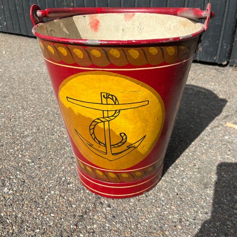 Brandspand metalspand i rød farve med låg og håndtag. Spanden har et vintage udseende med synlige brugsspor og patina. Egnet til opbevaring eller dekorative formål.