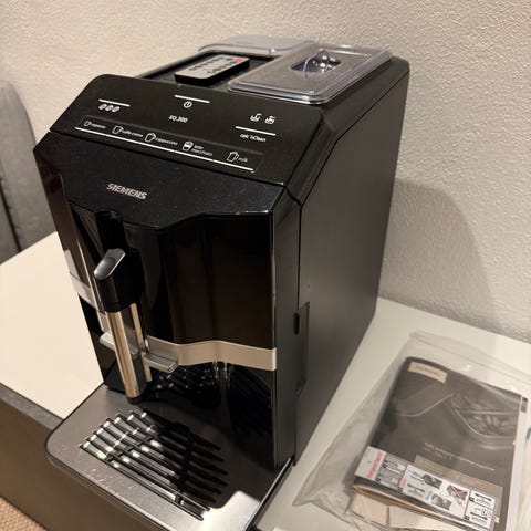 Siemens EQ.300 espressomaskine i sort farve. Maskinen har funktioner til espresso, kaffe crema, cappuccino og latte macchiato. Den er designet til at brygge forskellige kaffetyper med nem betjening.