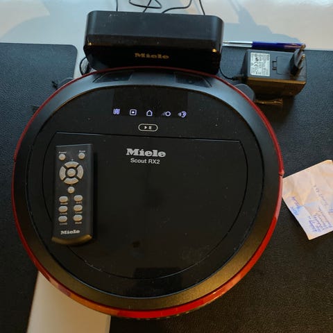 Miele Scout RX1 robotstøvsuger i sort farve. Enheden er designet til automatisk rengøring af gulve, fjernbetjening og opladningsstation inkluderet. Produktet har hjul til bevægelse og børster til effektiv støvsugning. Kun ganske lidt brugt, pæn og ren. ny pris fra 3500kr og op