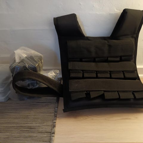 Justerbar træningsvest i sort med lommer til vægtlodder. Vestens design sikrer en tæt pasform under træning og kan tilpasses forskellige kropstyper. Velegnet til fitness og styrketræning.